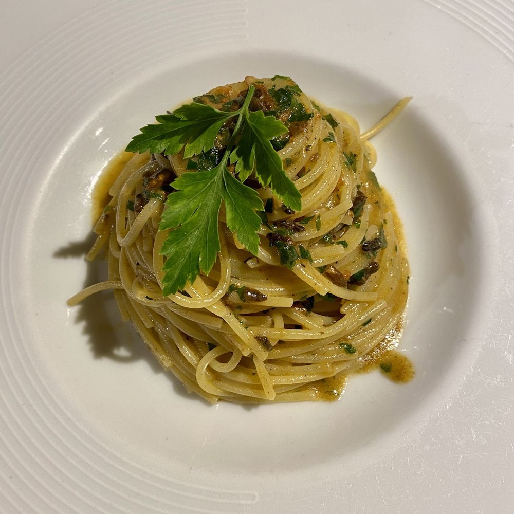 Big orecchiette with burrata, yellow tomatoes, and crispy bacon—a symphony of textures and flavors.